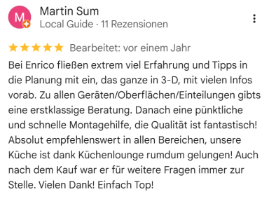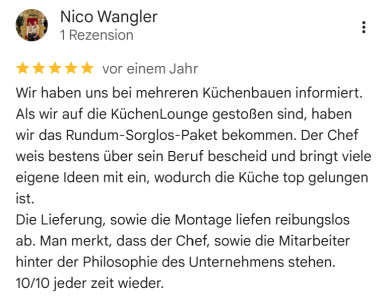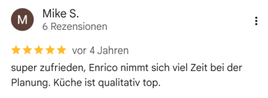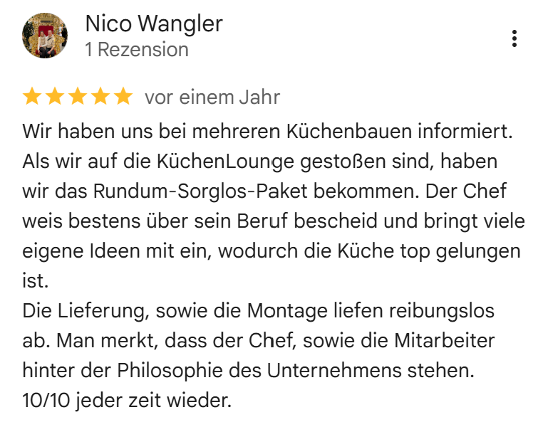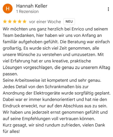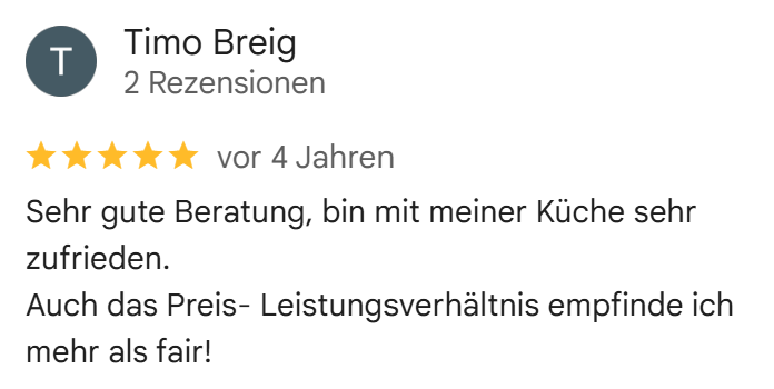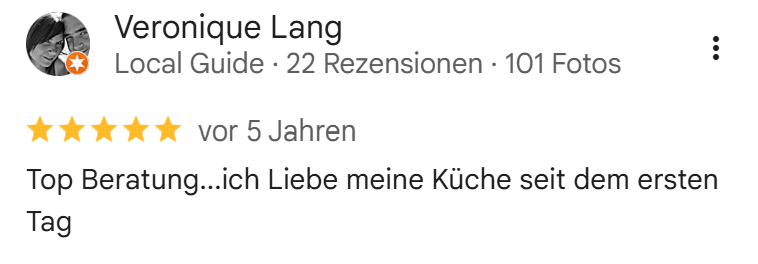Referenzen sind uns besonders wichtig, denn unsere Kunden liegen uns am Herzen. Wir freuen uns stets über positive Bewertungen, da sie uns motivieren, unsere Küchen so zu gestalten, dass unsere Kunden glücklich und zufrieden sind. Ihre Zufriedenheit ist unser größtes Anliegen!